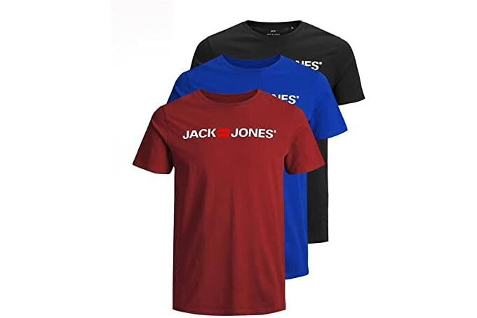 JACK & JONES Paquete de 3 Camisetas para Hombre, Negro/Surf The Web/Dahlia Roja, L (EU)