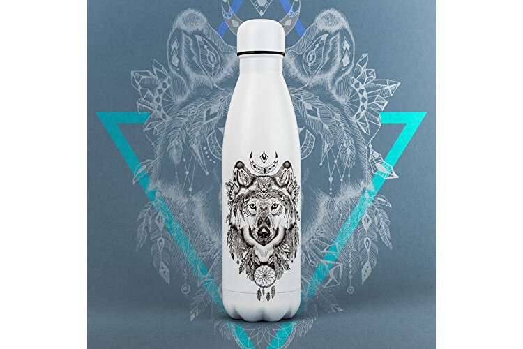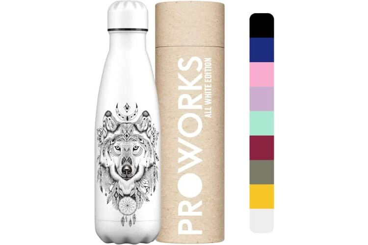 Proworks Botellas de Agua Deportiva de Acero Inoxidable | Cantimplora Termo con Doble Aislamiento para 12 Horas de Bebida Caliente y 24 Horas de Bebida Fría - 1L - Toda Blanca - Lobo Azteca