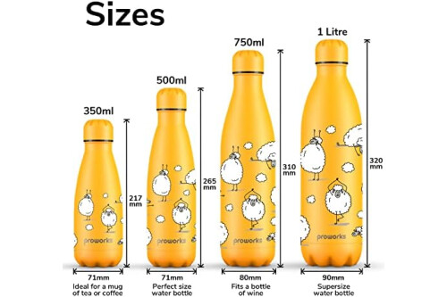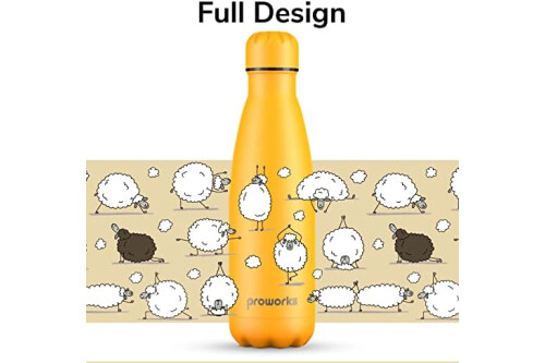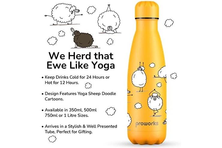 Proworks Botellas de Agua Deportivas de Acero Inoxidable Termo de Doble Aislamiento para 12 Horas de Bebidas Calientes y 24 Horas de Bebidas frías - 1 Litro - Amarillo - Oveja Yoga
