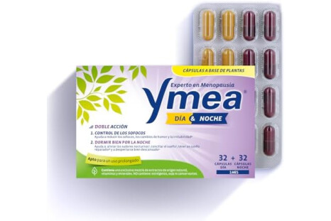 Ymea Día y Noche es un complemento alimenticio diseñado para mujeres en la menopausia. Con una fórmula de doble acción, las cápsulas amarillas ayudan a controlar los sofocos y la sudoración durante el día, mientras que las cápsulas púrpuras favorecen un sueño reparador por la noche, ayudando a reducir la fatiga y la inquietud nocturna. Este tratamiento está elaborado con extractos naturales como maca, salvia, rodhiola y bálsamo de limón, y enriquecido con vitaminas B6, B12 y D3. Ymea Día y Noche es libre de estrógenos, soja y conservantes, y es apto para un uso prolongado, proporcionando alivio continuo para los síntomas de la menopausia. Con 64 cápsulas, es ideal para un mes de tratamiento. Ymea, tu experto en menopausia.