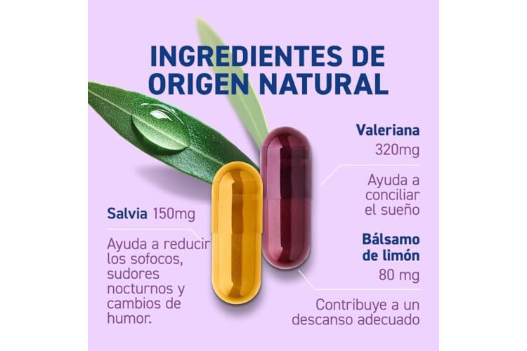 Capsula de dia: Extracto de salvia, extracto de raiz de maca, cubierta de la capsula: hidroxipropilmetilcelulosa, oxido de hierro, extracto de raiz de rodiola, agente de carga: polvo de arroz bloanco, agentes antiaglomerantes: maltodextrina, estearato de magnesio, dioxido de silicio, vitamina B12: manito, cianacobalamina, clorhidrato de pirodoxina, Vitamina D (colecalciferol, almidon, sacarosa). Capsula de noche: extrato de raiz valeriana, Extracto de salvia, Extracto de balsamo de limon, cubierta de la capsula: hidroxipropilmetilcelulosa, zanahoria purpura, agente de carga: polvo de arroz blanco, anti-agentes de coccion: maltodextrina, estearato de magnesio, dioxido de silicio, Vitamina D (colecalciferol, almidon, sacarosa)
