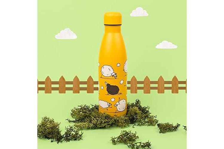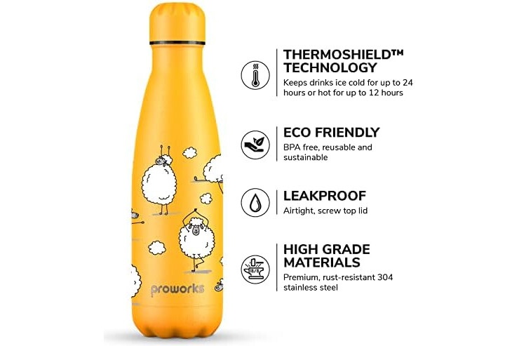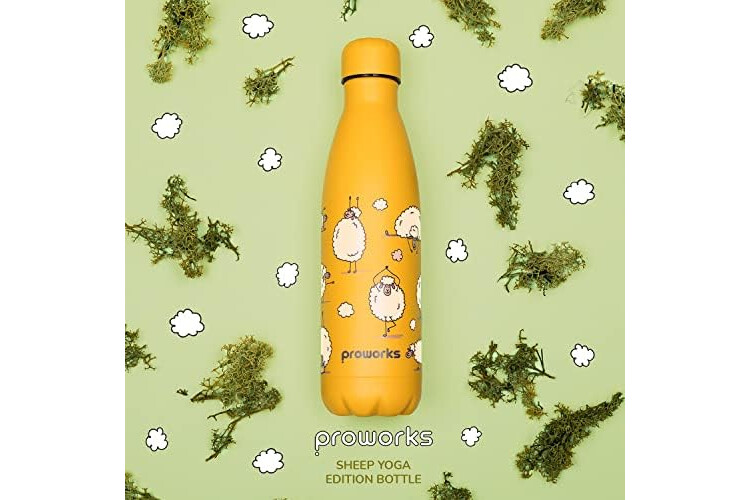Proworks Botellas de Agua Deportivas de Acero Inoxidable Termo de Doble Aislamiento para 12 Horas de Bebidas Calientes y 24 Horas de Bebidas frías - 500ml - Amarillo - Oveja Yoga
