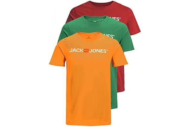 JACK & JONES Paquete de 3 Camisetas para Hombre, Rio Red/Verde Verdant/Dark Cheddar, XXXL (EU)