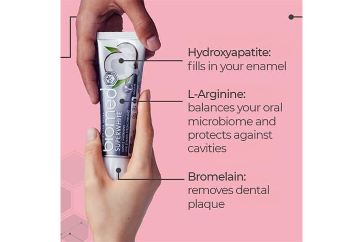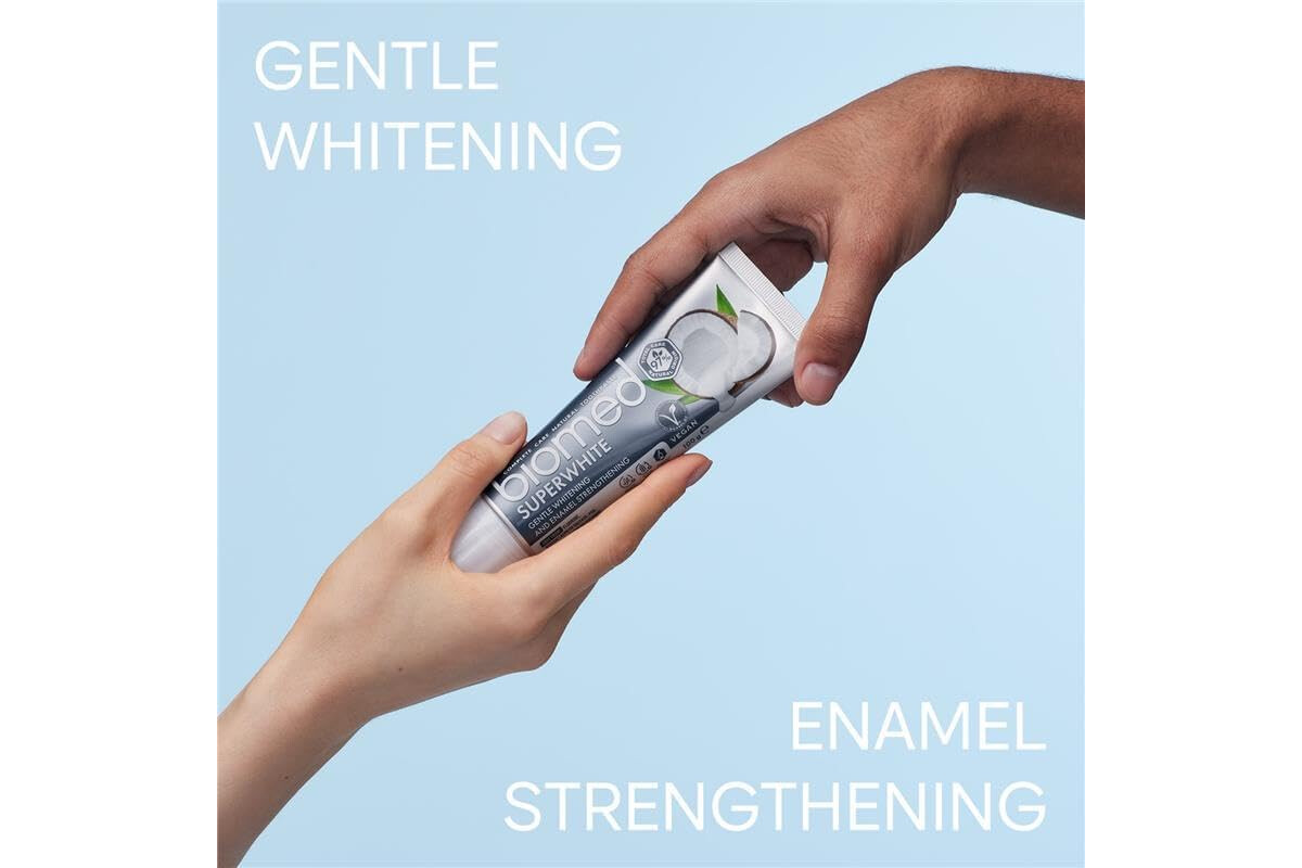 Biomed Pasta dental Superwhite de cuidado total para blanquear suavemente el esmalte dental sensible.