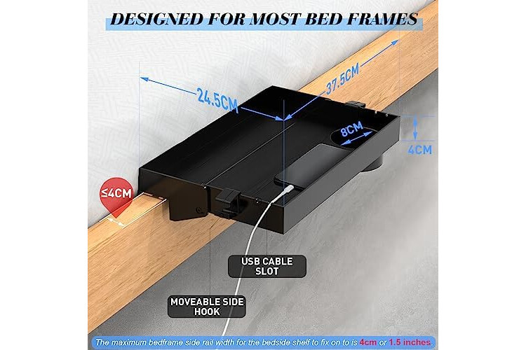 Estante de cama de diseño íntimo: con una gran superficie de 24,5 x 37,5 cm y bordes altos en todos los lados, esta estantería para literas puede mantener los artículos en su lugar. Los portavasos a prueba de fugas mantienen las bebidas más seguras. Los 4 orificios laterales permiten una buena fijación del cable de carga del teléfono. Dos ganchos móviles son convenientes para colgar objetos pequeños.