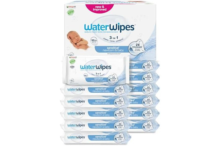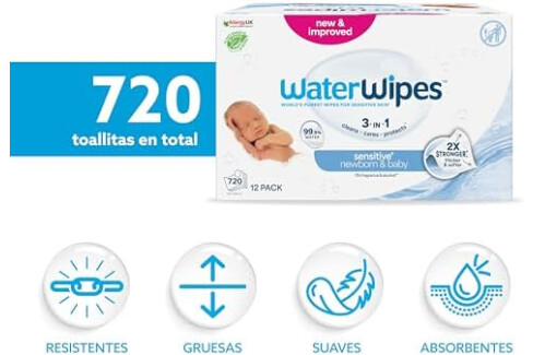 WaterWipes Sensitive+ Newborn & Baby Wipes, Toallitas Para Recién Nacidos y Bebés, 720 unidades (paquete de 12), 3 en 1 Limpia, Cuida, Protege, 99,9% Agua, Sin perfume