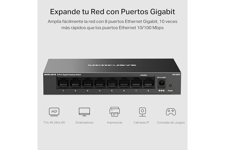 • Puertos Gigabit Completos: 8 × 10/100/1000 Mbps con Auto-Negociación en puertos RJ45 que soportan Auto-MDI/MDIX.