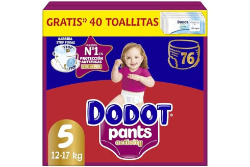 Dodot Pañal-Braguita Activity Pants , Talla 5 (12-17 kg), 76 Pañales + Regalo de 1 Pack de 40 Toallitas, Con Ajuste 360 anti-fugas extra suave