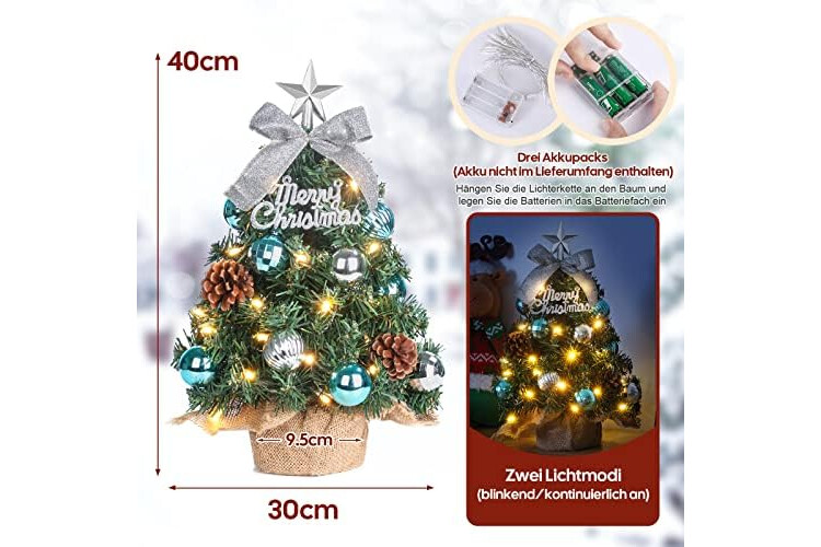 Árbol de Navidad de mesa con luces blanco cálido: equipado con una cadena de luces blanco cálido de 3 m con 30 ledes. Esta cadena de luces led es resistente a las salpicaduras y la luz tiene 2 modos de iluminación, encendido permanente e intermitente