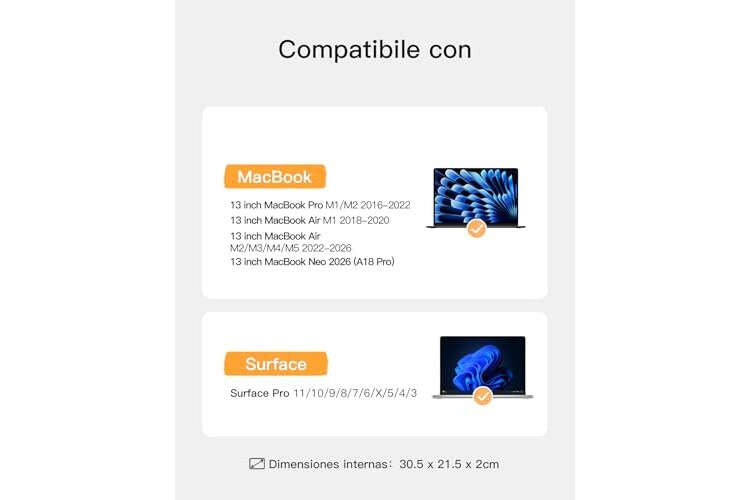 Compatibilidad: dimensiones internas: 30,5 × 21,3 × 2 cm. Compatible con 13.3"MacBook Pro 2016-2022(M2/A2686, M1/A2338, A2251, A2289, A2159, A1989, A1708, A1706),13.3"MacBook Air 2018-2020 (M1/A2337, A1932, A2719),13.6" MacBook Air 2022-2026 (M2/A2681,M3/A3113, M5/A3449), 13" MacBook Neo (A3404). Compatible con Surface Pro 11/10/9/8/7/6/X/5/4/3.