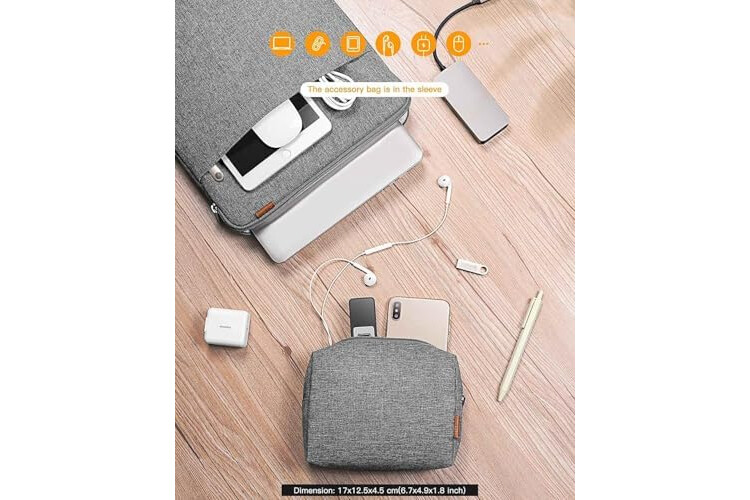Compartimiento de accesorios: Hay una bolsa con cremallera en la parte delantera que puede facilitar el almacenamiento de pequeños objetos como llaves, cables, tarjetas, papeles y ratón. La bolsa de accesorios extra puede contener artículos. La bolsa de accesorios se encuentra en la funda.
