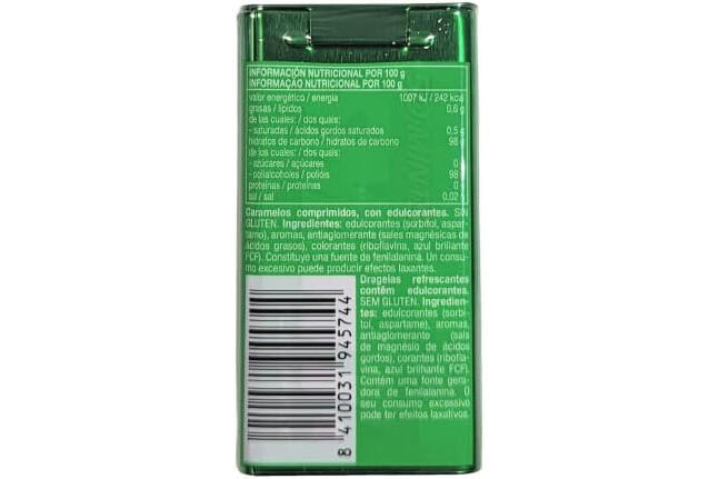 • Caramelo comprimido Smint Tin sin azúcar con sabor a Hierbabuena. El producto contiene 12x35g de caramelos comprimidos.
