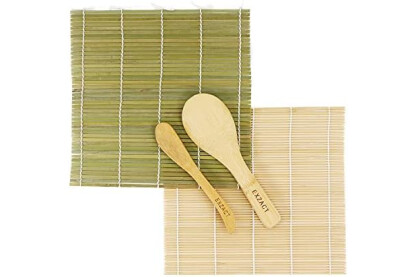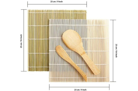 Kit premium de 4 piezas para enrollar sushi – Incluye 2 x esteras de bambú (24 x 23cm / 9.5 x 9 pulgadas), 1 x paleta de arroz (20 x 6cm / 6 x 2.5 pulgadas) y 1 x esparcidor de arroz (19 x 3cm / 7.5 x 1.2 pulgadas).