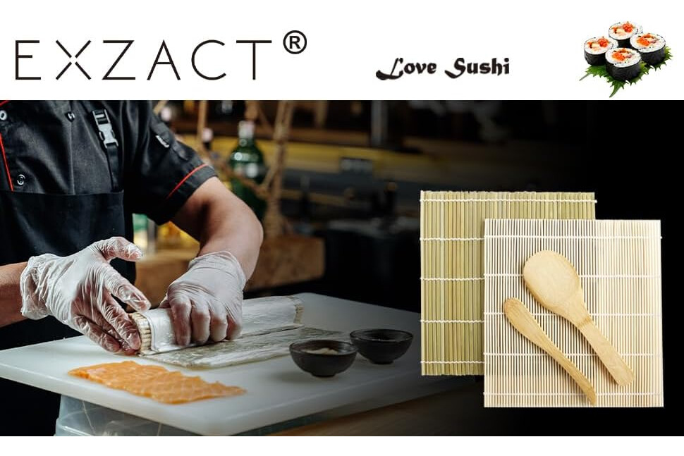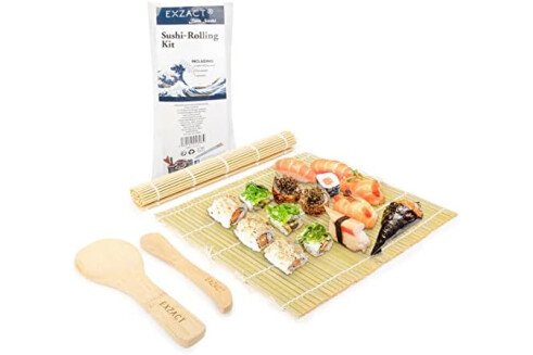 Exzact Kit de bambú para enrollar sushi 4 piezas – 2 x esteras, 1 x paleta de arroz, 1 x esparcidor de arroz, Todo natural (EX-SR04)