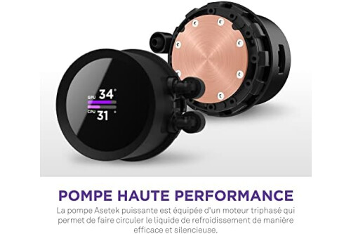 La pompe Asetek puissante est équipée d'un moteur triphasé qui peut atteindre les 2 800 tr/min pour garantir une circulation efficace et silencieuse du liquide de refroidissement.