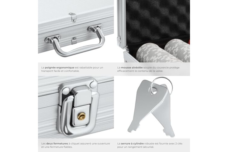 UNE MALLETTE PRATIQUE ET SÉCURISÉE. Rangez et transportez facilement tout votre matériel dans la mallette robuste en aluminium, équipée de deux clés pour garantir la sécurité de vos jetons et cartes. Idéale pour les déplacements, cette mallette de poker est conçue pour durer et simplifie l'organisation de vos soirées jeux.