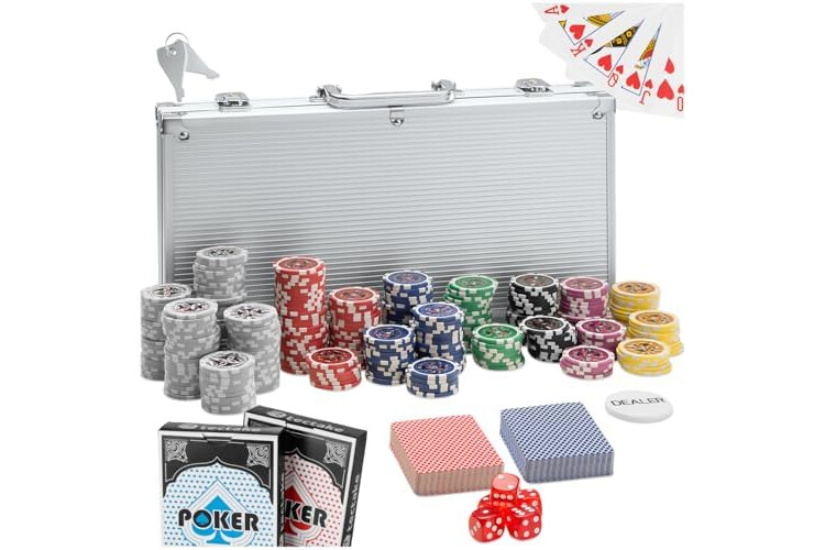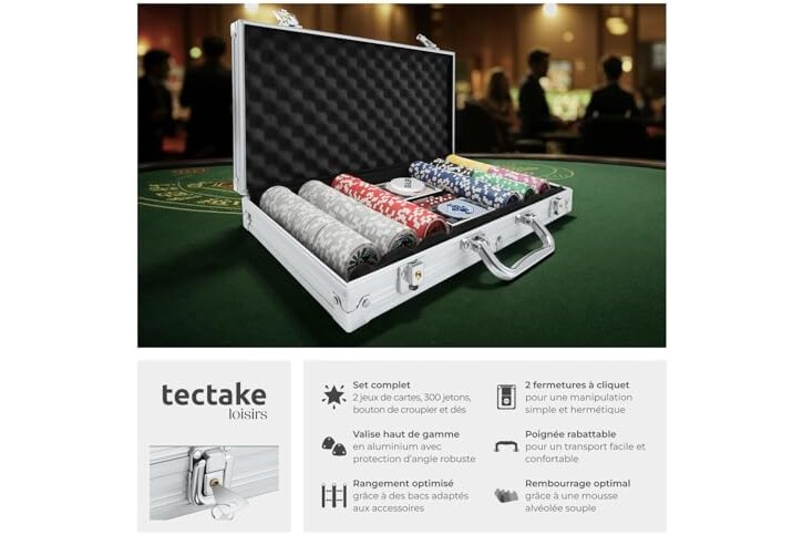 TOUCHEZ LE LUXE DU CASINO CHEZ VOUS ! Transformez votre salon en table de poker digne de Las Vegas avec ce coffret en aluminium premium. Avec 300 jetons de qualité professionnelle, 2 jeux de cartes et 5 dés, ce set complet est parfait pour vos soirées entre amis ou en famille. Profitez d’un véritable jeu d’ambiance pour des heures de compétition et de fun.