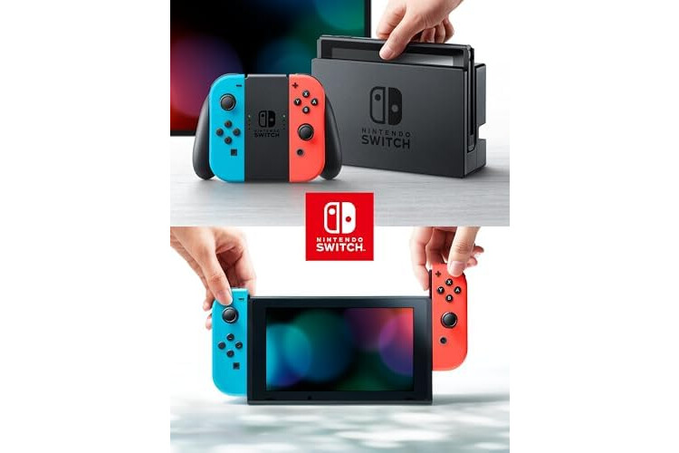 • 1 console avec 1 manette Joy-con droite rouge néon et 1 manette Joy-con gauche bleu néon