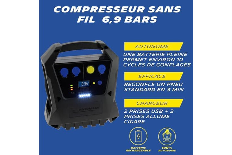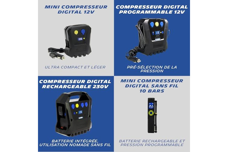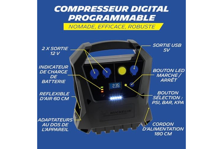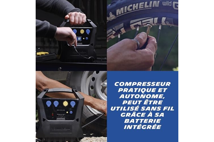 | Composants inclus | 1 compresseur nomade + 3 embouts de gonflage + 1 cordon alimentation |