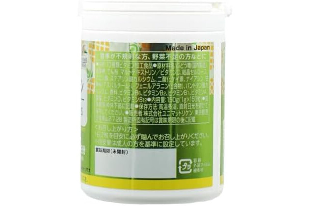 Glucose, maltodextrin, maltodextrin, apple juice powder (concentrated apple juice, dextrin, sugar), barley grass leaves, vegetable mix powder, vegetable fermentation, vitamin C, citric acid, crystal cellulose, fragrance, silicon dioxide, calcium stearate, niacin, calcium pantothenate, sweeteners (asspa) Luteem L-1. Phenylalanine Compound), Vitamin A, Vitamin D, Vitamin B12, Malic Acid, Vitamin B1, Vitamin B6, Vitamin B2, Folic Acid (some of the ingredients include wheat, apple, banana)