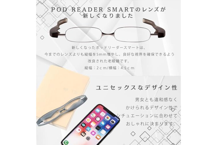 Compared to the Pod Reader Slim, it is 5 mm larger in height, making it a more comfortable size for those who found the Slim difficult to see The lenses are thin and light, double-sided aspherical lenses, resulting in less distortion and a clear, comfortable view The difference between aspherical lenses and spherical lenses is that spherical lenses have less distortion in the center because the lens is curved, but the further you move from the center, the more distorted it appears Among them, the Pod Reader features dou...