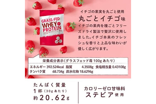 Contents: 33.5 oz (1,000 g); Features: 100% WPC80 whey protein (storage): Comes in a convenient stand zipper bag. Ingredients: Milky protein (Australian), strawberry powder (strawberry, lactose, glucose) / sweetener (stevia), (some of the ingredients include milk)