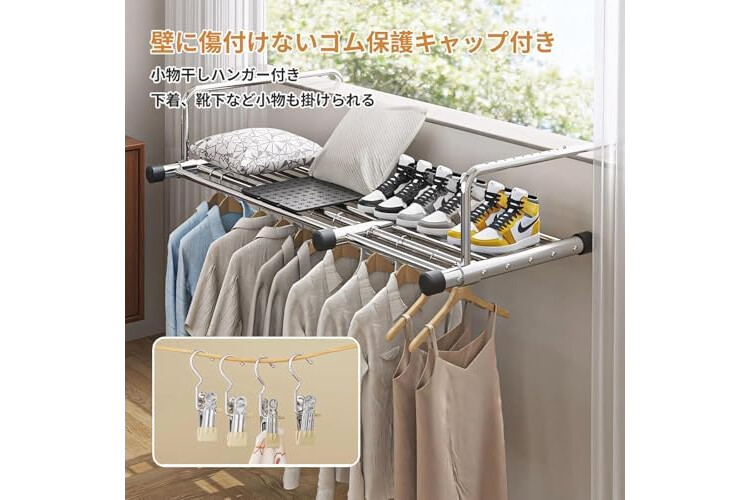(10-step sliding type and easy adjustment) The drying rack uses a spring-loaded clicking mechanism that allows you to adjust the width of the rack handle to the appropriate size according to the location of use. This allows you to hang it freely without restricting it depending on the situation. The drying rack is suitable for walls within 6.7 inches (17 cm)