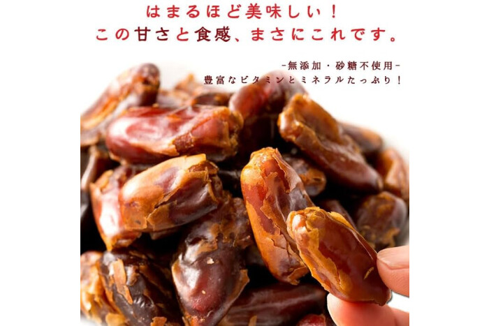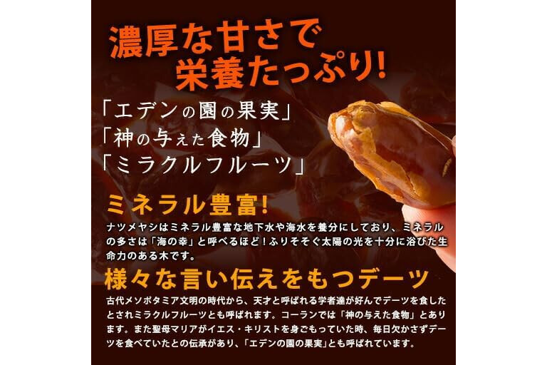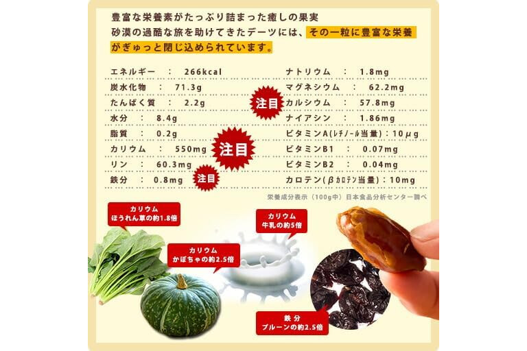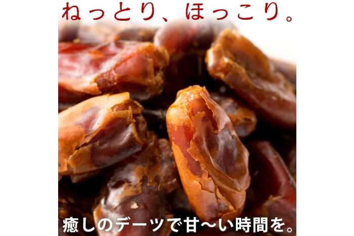 It features a rich texture and sweetness that resembles brown sugar. Dates refers to the nutme palm that lives in a desert oasis. It is said to be a food across the desert with high nutritional value called "Fruit of the Garden of Eden, "Food given by God". It is still a great nutrition food for mountain climbing and sports. It is said to contain a rich amount of minerals such as iron, calcium, potassium, and phosphorus. Iron is comparable to spinach, potassium is 1.5 times more than pumpkins and spina. It is also rich i...