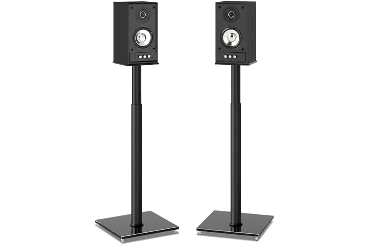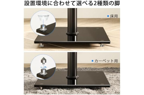 2 types of mounting legs and excellent stability: Comes with 2 types of carpet spike feet and anti-slip pads for floor to ensure stability even on uneven floors. 11.8 x 11.8 inches (300 x 300 mm) tempered glass base disperses the center of gravity and prevents the speaker table from falling over