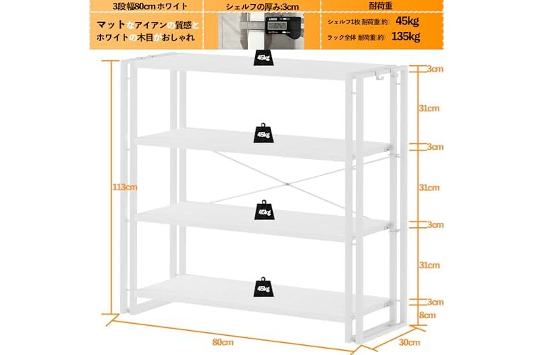 ★【Product Size】Width 80 Depth 30 Height 88 cm Height between shelves: 31cm Shelf thickness: 3 cm (1.18 inches) Approximate Load Capacity: Each shelf: 99.2 lbs (45 kg) Materials: MDF, steel Color: White