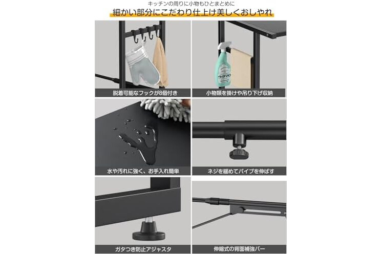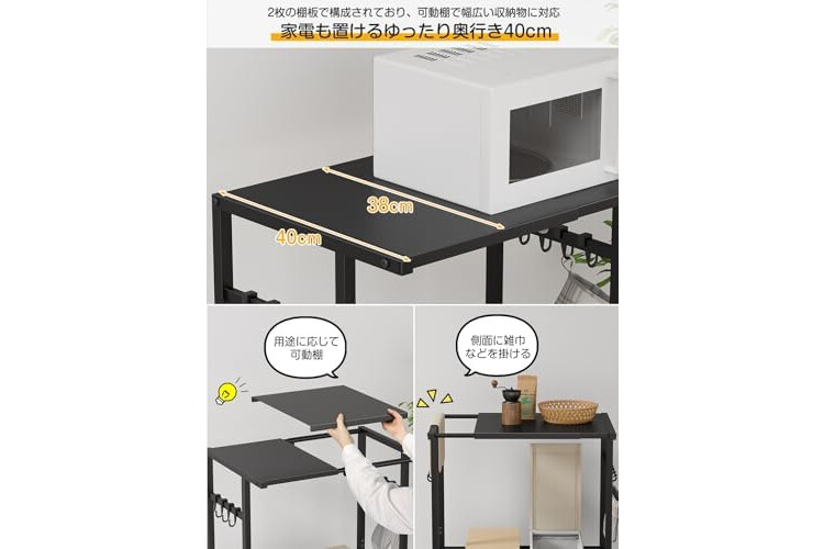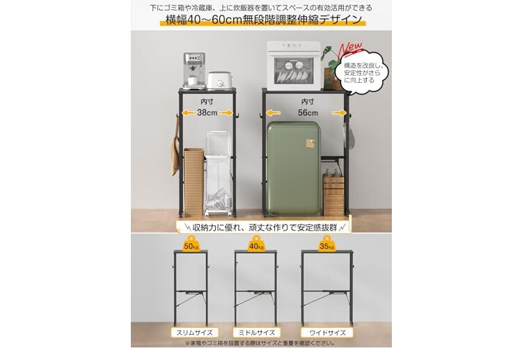 【Renewal Trash Can Top Rack Specifications】Size: (External dimensions) Approx. 40~60 x Depth 46 x Height 86.5 cm, (Internal dimensions) Approx. 36~56 x Depth 38 x Height 84.5 cm Comes with 8 hanging hooks Material: Steel (rust-resistant powder coating), Load Capacity: Approx. 88.2 lbs (40 kg) Create an efficient kitchen space by securing storage space in the dead space above the trash can with the trash can upper rack