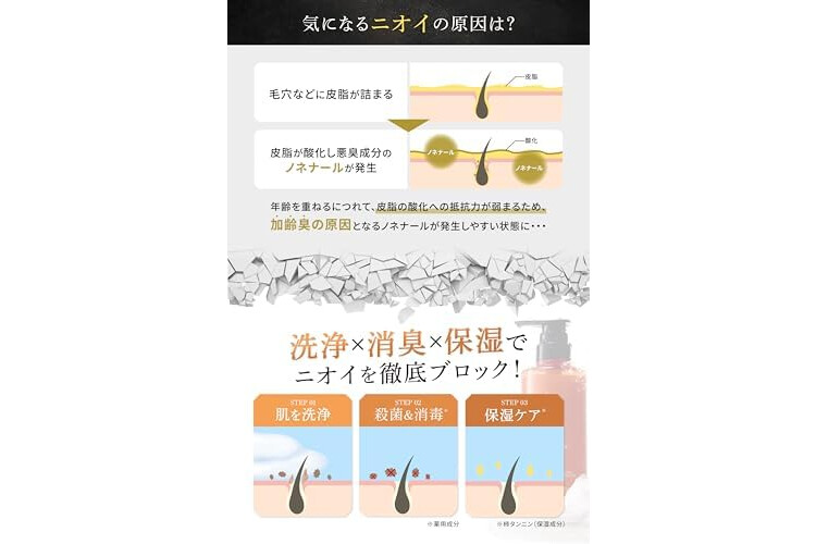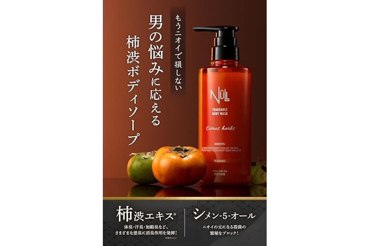 [Completely removes sweat and skin dirt to prevent odors from men] Contains persimmon tannin (moisturizing ingredient) and cymen-5-ol Prevents sweat odor, foot odor, and aging odor Daily body care thoroughly washes away sweat and sebum that can cause odors Fine foam cleans even deep pores thoroughly