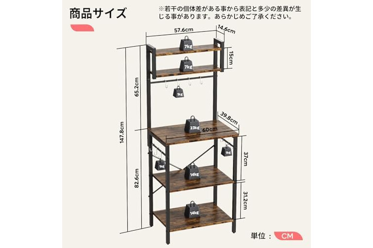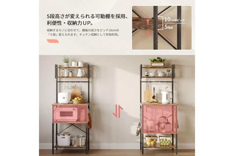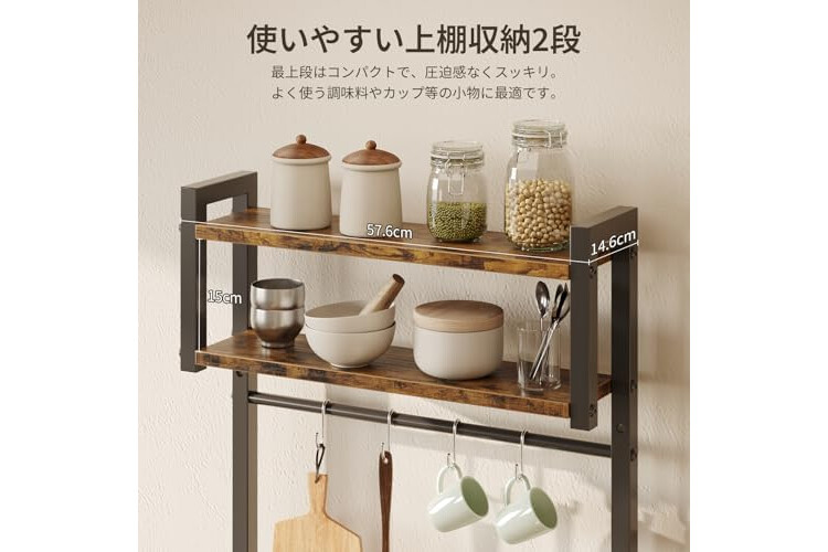 | Special features | 23.6 inches (60 cm) wide for narrow spaces, lower shelf height can be changed, and includes 10 universal S hooks |