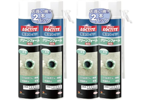 Package Contents: LOCTITE Foaming Urethane Green Foam Big 570g x 2 tubes - Economical one-liquid foaming urethane, versatile for filling all gaps, soundproofing, and insect/rodent control