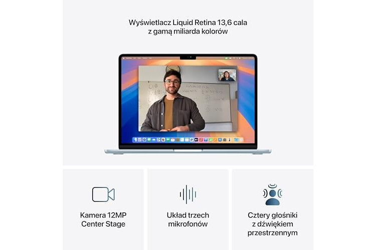 OLŚNIEWAJĄCY WYŚWIETLACZ – Wyświetlacz Liquid Retina 13,6 cala obsługuje miliard kolorów*. Zdjęcia i filmy imponują kontrastem i bogactwem detali, a tekst jest wyjątkowo czytelny.