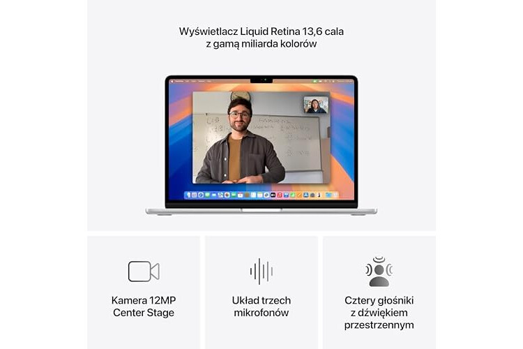 OLŚNIEWAJĄCY WYŚWIETLACZ – Wyświetlacz Liquid Retina 13,6 cala obsługuje miliard kolorów*. Zdjęcia i filmy imponują kontrastem i bogactwem detali, a tekst jest wyjątkowo czytelny.