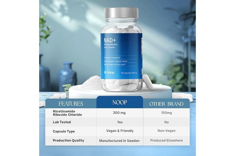 NAD+ Booster with Premium Quality - Noop NAD+ offers 300mg of high quality Nicotinamide Adenine Dinucleotide per capsule, which acts as a powerful NAD+ booster. This effectively supports energy production, anti-aging, and DNA repair for optimal results.