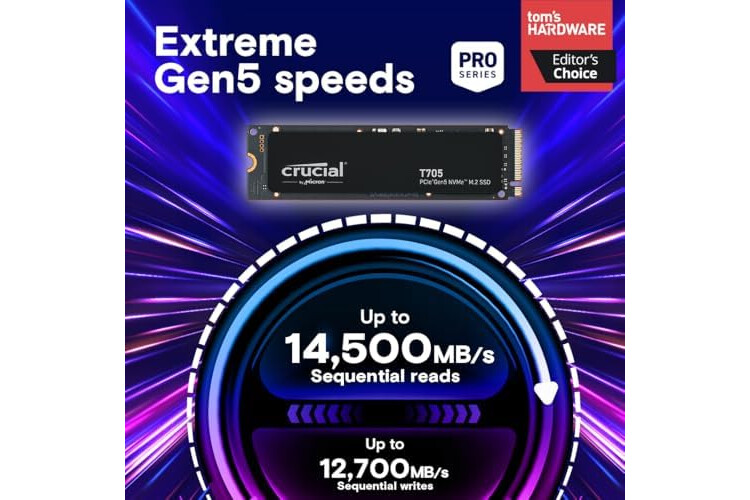 Crucial T705 2TB PCIe 5.0 x4 Gen5 NVMe M.2 Internal SSD, Up to 14,500MB/s Read, 12,700MB/s Write, For Desktop, TLC NAND, Solid State Drive - CT2000T705SSD3