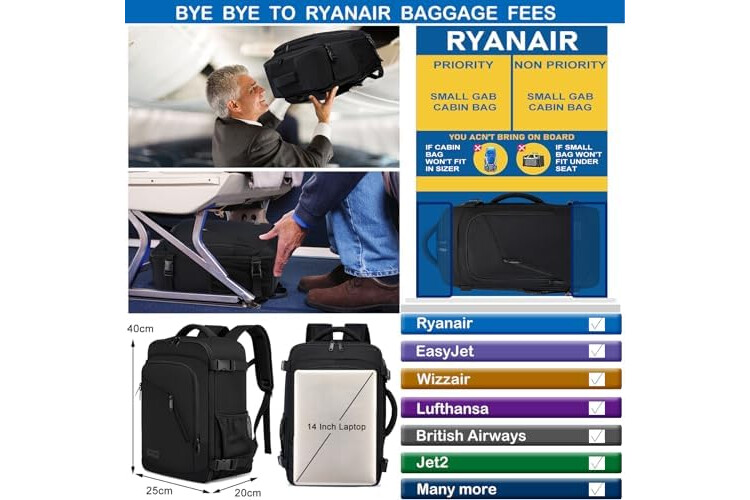 Perfect size cabin bag for Ryanair and fits under the seat of an airline-friendly size: The size of the cabin backpack is 40 x 20 x 25 cm, capacity: 20 l. Perfect size meets Ryanair's free carry on luggage. There is no need to worry about paying extra for oversize. It is so compact that it can be placed in the outer compartment and under the seat. In addition to Ryanair, this underseat bag is suitable for most major airlines, for easyJet, British Airways, Qantas, Etihad, Wizz Air, Jet2, etc.