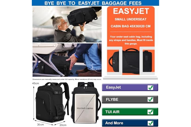 Designed for EasyJet cabin bags of 45 x 36 x 20 for a new EasyJet bag that fits under the seat. The size of the cabin backpack is 45 x 36 x 20 cm. Capacity: 30L. Perfect size conforms to EasyJet free under seat cabin bag. No need to worry about paying extra for a large luggage. Warm Tips: Measured when the backpack is packed, do not overload it, otherwise it will exceed the actual size. This travel cabin bag is so compact that it can be placed in the cabin compartment and under the seat.