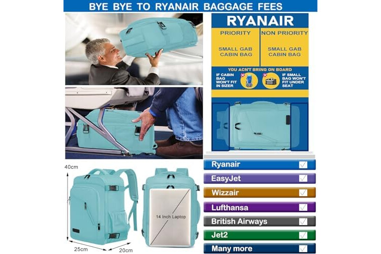 Perfect size cabin bag for Ryanair and fits under the seat of an airline-friendly size: The size of the cabin backpack is 40 x 20 x 25 cm, capacity: 20 l. Perfect size meets Ryanair's free carry on luggage. There is no need to worry about paying extra for oversize. It is so compact that it can be placed in the outer compartment and under the seat. In addition to Ryanair, this underseat bag is suitable for most major airlines, for easyJet, British Airways, Qantas, Etihad, Wizz Air, Jet2, etc.