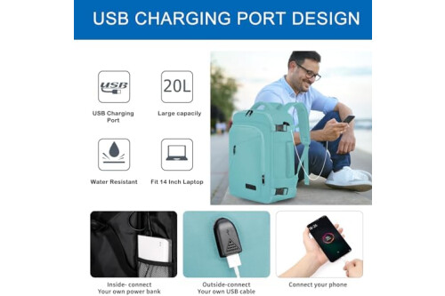 Under Seat Cabin Bag, Small Travel Case, Carry-on, Backpack, Cabin Size, for Airplane, Flight Bag, Travel Backpack with USB Charging Port, GGREEN, 40 x 20 x 25CM-20L
