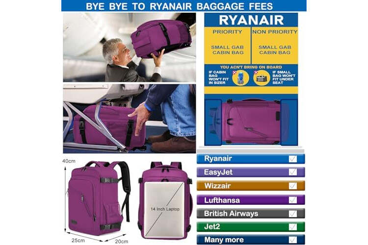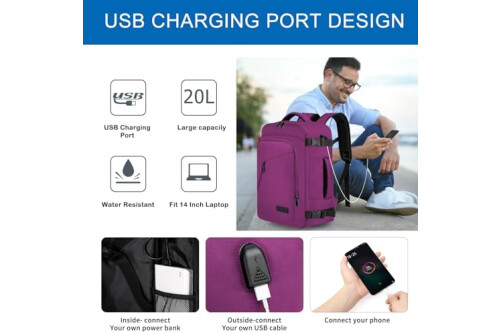 Underseat Cabin Bag, Small Travel Bag, Carry-on, Backpack, Cabin Size, for Airplane, Flight Bag, Travel Backpack with USB Charging Port, purple, 40 x 20 x 25 cm-20L, Modern, Classic