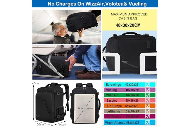 The perfect size of travel backpacks: The size of the backpack is 40 x 30 x 20 cm. Capacity: 20L. Backpack weight: 0.85kg. It is so compact that it can be stored in the luggage compartment and under the seat. Suitable for most major airlines: Wizz Air (40 x 30 x 20 cm), Easyjet, Lufthansa, Eurowings (40 x 30 x 25 cm), Vueling (40 x 30 x 20 cm), Air France, Norwegian Air, KLM, Austrian Air. lines and others.