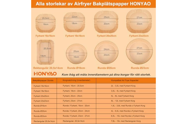 【Widely Used】20x20cm Square Air Fryer Baking Paper can be used for baking or storing food, suitable for air freezers, microwave ovens and ovens etc. Inner diameter: 20 cm. Outer diameter: 25 cm. As the ideal accessory for hot air fryer, it is compatible with the following hot air fryers: As the ideal accessory for air freezers, it is compatible with the following airfryers: Philips 6.2L/7.2L/7.3L, Russell Hobbs 5L/5.5L/8L, COSORI 5.5L/6L/6.2L /6.4L, Cecotec 5.5L/6L/6L/6L/6L/6L/6L/6L/6L/6L/6L/6L/6L/6L/6L/6L/6L / 6L .5L/7L/7.6L, Ninja 6.2L, Tefal 6.5L, CLAMER 5.5L, Xiaomi 6L/6.5L, Panasonic 6L, and other airfryers with 5l - 8l baskets