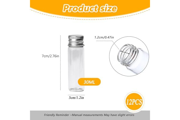 VASANA 12PCS 30ml Clear Glass Cute Strong Decorative Bottles Vials Tube Jars Cans Container with Aluminum Cap for Cosmetics Dispensing Sample Message Essential Oil Powders Wishing Storage