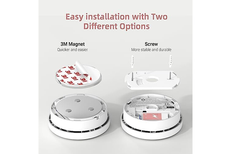 [Easy Installation] The smoke detector is available with two mounting options, you can choose a convenient magnetic holder or secure screw mounting. No more hard wiring.