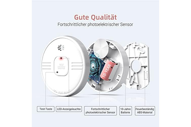 smoke alarm, 10-year smoke detector, fire alarm with built-in 10-year lithium battery, smoke alarm with test button, EN 14604 Certified, home fire protection, 208B, 1 pcs
