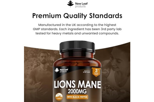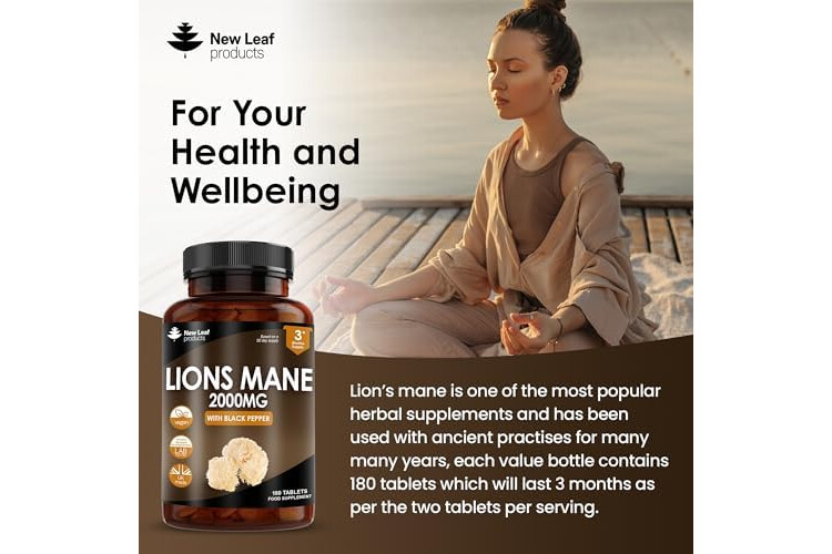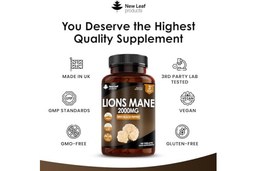 Lions Mane Mushroom 2000mg - 180 High Strength Vegan Tablets - Lion's Supplement with Black Pepper - Mushrooms Extract (Not Powder or Capsules) Made in The UK by New Leaf products
