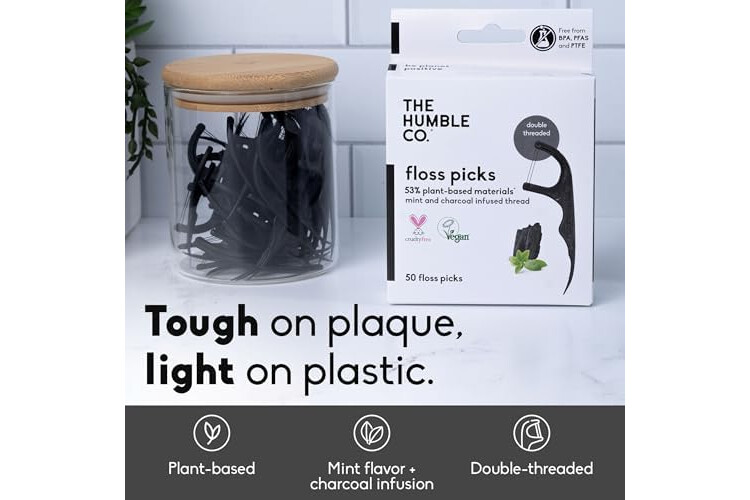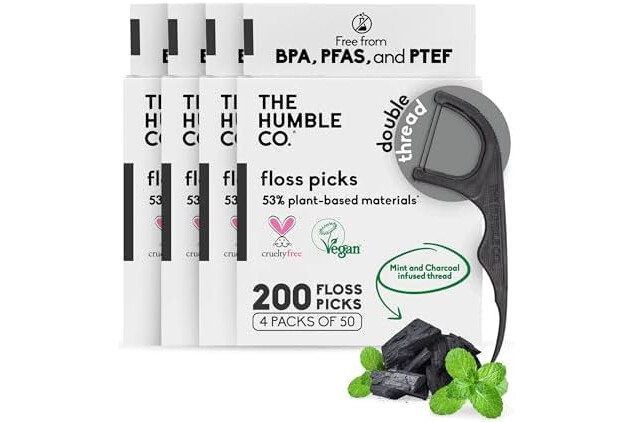 The Humble Co. Plant Based Floss Picks|Charcoal | Eco-Friendly, Vegan for Your Everyday Oral Care - Dentist Approved - Removes Plaque and Gives a Fresh Feel (4 x 50p)